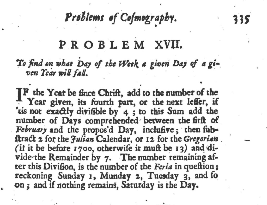 The reference for this new find is Jacques Ozanam’s Récréations Mathématiques et Physiques, 1694 (p. 335 of the 1708 English edition). This appears to be the earliest known publication featuring an algorithm for calculating the day of the week given a date; it was published more than 100 years before Gauss came up with his algorithm and nearly 200 years before Zeller published his.