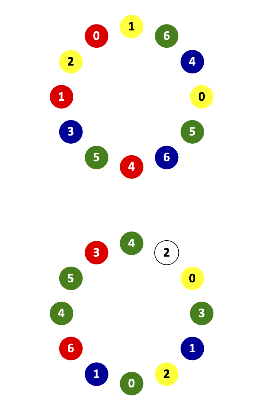 - Convert D to a clock position. Spell the color of the corresponding circle from top to bottom.