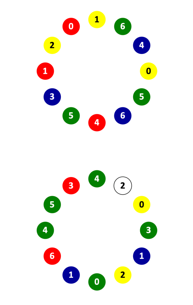 Note: the blank circle in the 1:00 position on the unbalanced clock face has no color, so you don’t move any cards from the top to the bottom in that case. (Do not spell “white”!) The other four colors are red, blue, yellow, and green.